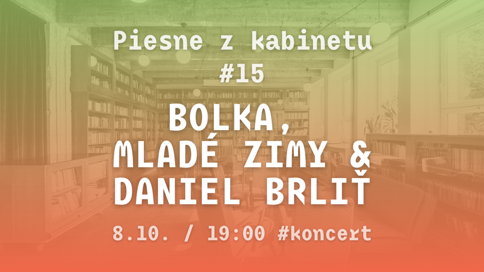 Piesne z kabinetu #15 prinesú pestrú zostavu: Bolka so svojou podvratnou počítačovou hudbou na hrane humoru a vážnosti, Mladé Zimy s experimentálnym pesničkárstvom a len 15-ročného Daniela Brlita, ktorý predstaví svoje čerstvé indie-popové EP v akustickej podobe.