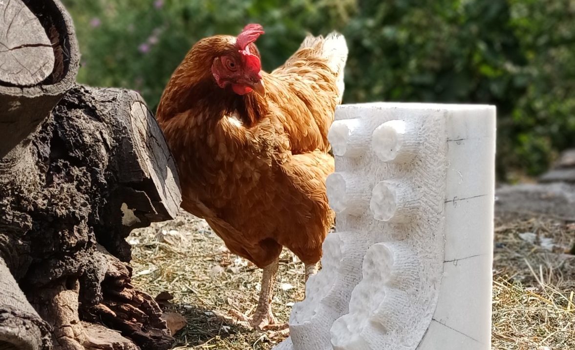 Séria mramorových sôch umiestnených vo výbehu pre sliepky vytvára zmenšené mesto.