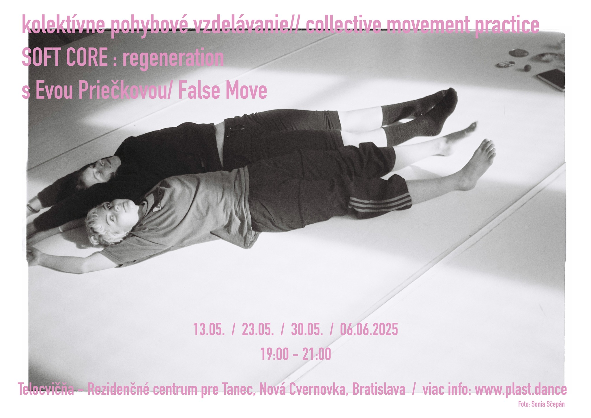 Soft Core je akási metafora odboja proti silnému a stabilnému centru. Ako môže byť mäkkosť, jemnosť, či slabosť našou tvorivou inšpiráciou? Ako sa môžeme vďaka nim spoločne ponárať smerom k hlbšiemu oddychu a vzájomnému počúvaniu? Natrieť med na rany, trhliny a diery v nás? Soft Core je pohybové kolektívne vzdelávanie, ktoré emancipuje vtelenú zmyslovú skúsenosť ako rovnocennú vedomosť tela a mysle. Nevyhýba sa kritickému mysleniu, ani hre a experimentu. Je to zamyslenie sa, kontemplácia a ponorenie sa do bádania pohybu, ale aj odhodenie kabátov a odpútanie sa z okov každodennosti.